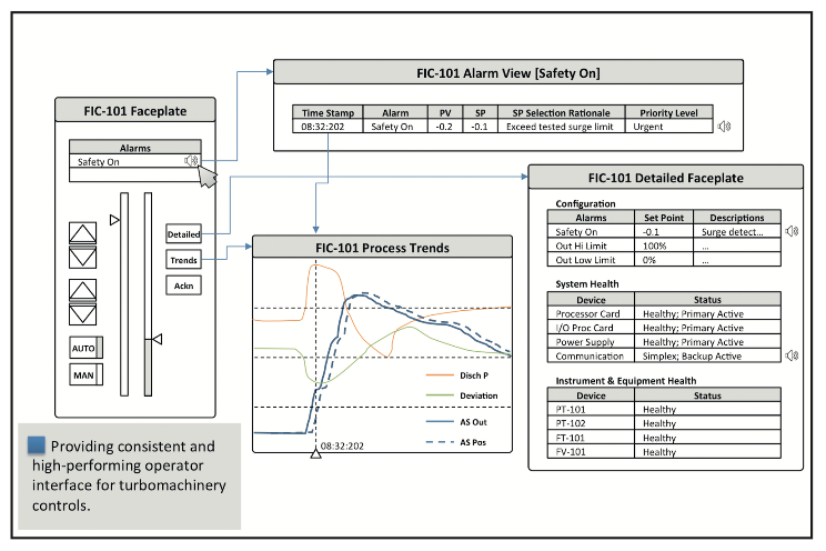 Cuando se desarrollan diseños estándar para la interfaz de aplicación TMC, se debe tener cuidado de que los módulos de visualización sigan los mismos estándares de HMI al igual que el resto de la HMI del DCS. Esto incluye el diseño de la placa frontal, la integración de alarmas y de tendencias de procesos. La integración de alarmas racionalizadas, los datos de diagnóstico de instrumentos y equipos y los parámetros de configuración de lazo críticos son fundamentales para crear una interfaz de operador de alto rendimiento.